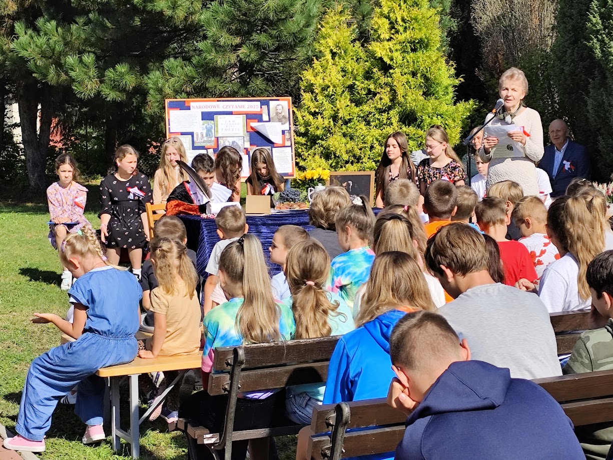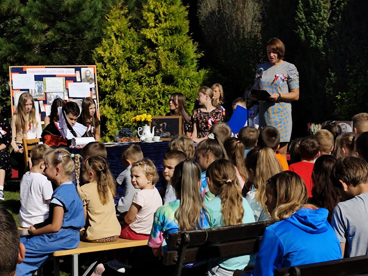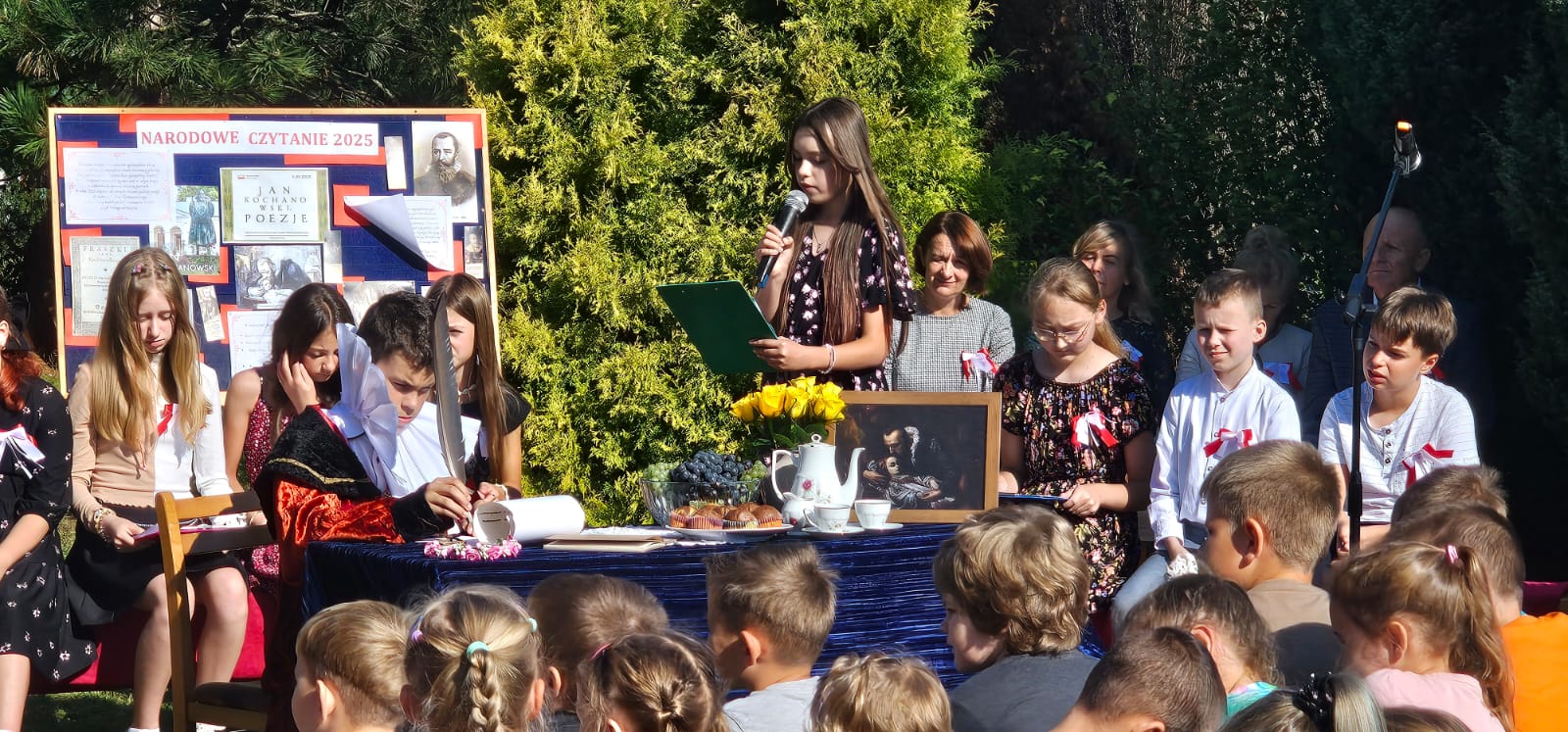 w ramach ogólnopolskiej akcji Narodowego Czytania. To wyjątkowe wydarzenie odbyło się w pięknej scenerii ogrodu przy Szkole Podstawowej, gdzie w promieniach wrześniowego słońca wybrzmiały słowa jednego z największych polskich poetów – Jana Kochanowskiego. Spotkanie rozpoczęło się w niezwykły sposób – przywitał nas sam Jan Kochanowski, w którego wcielił się uczeń szkoły. Ten symboliczny gest wprowadził wszystkich w atmosferę dawnych czasów i przypomniał, że dzieła mistrza z Czarnolasu są wciąż żywe i aktualne. Następnie rozpoczęło się wspólne czytanie. Do grona lektorów zaproszonych przez organizatorów dołączyli: Pani Dyrektor SP Katarzyna Osika, Pani sołtys Katarzyna Podraza, emerytowana nauczycielka Pani Zofia Starzyk, Pan radny Stanisław Wabno oraz dzieci i młodzież z Dyskusyjnego Klubu Książki. Razem pochyliliśmy się nad utworami, które od wieków budują naszą tożsamość literacką: fraszkami, pieśniami i trenami. Były chwile zadumy, refleksji, ale także uśmiechu, gdy padały dowcipne wersy Kochanowskiego.To wyjątkowe spotkanie pokazało, że literatura potrafi łączyć pokolenia – od najmłodszych po seniorów – a wspólne czytanie to nie tylko tradycja, ale i piękna forma integracji lokalnej społeczności. Na zakończenie każdy uczeń otrzymał pamiątkowy stempel w zeszycie do języka polskiego – symbol udziału w tegorocznym Narodowym Czytaniu. Serdecznie dziękujemy wszystkim czytającym i słuchaczom za obecność i wspólne przeżywanie tego literackiego święta. Już teraz zapraszamy na kolejne spotkania z literaturą – bo słowa mają moc, która łączy ludzi! Organizatorami wydarzenia były: Biblioteka Publiczna oraz Biblioteka Szkolna.