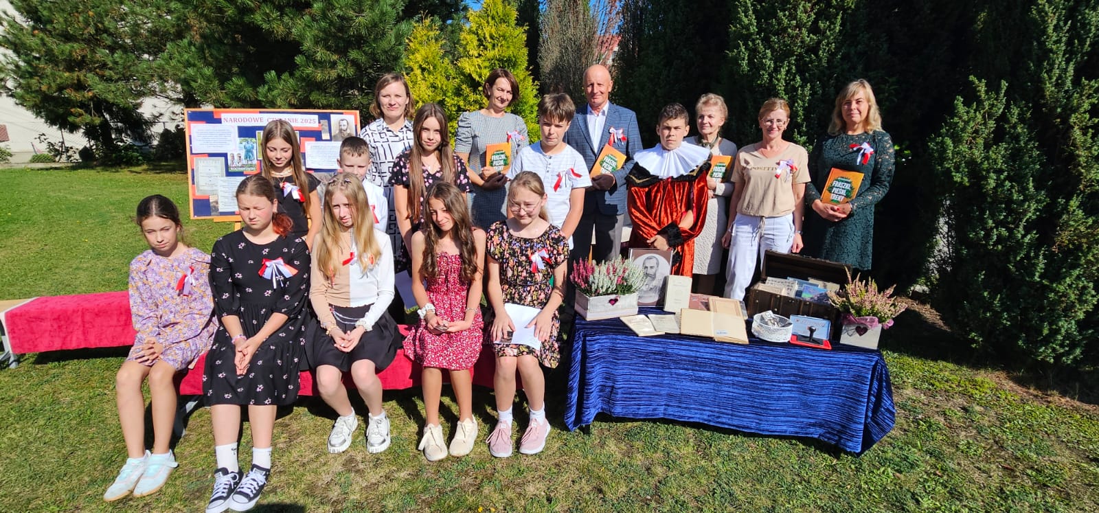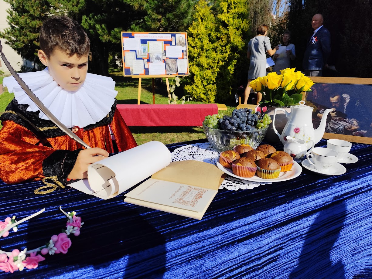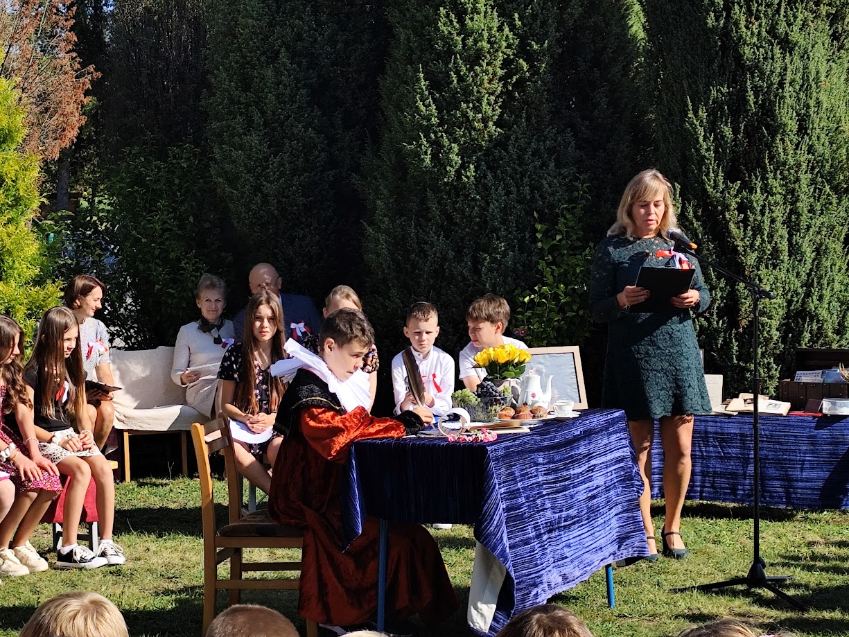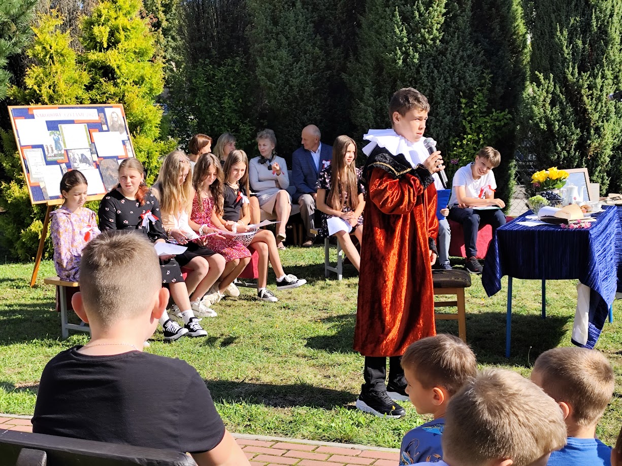 w ramach ogólnopolskiej akcji Narodowego Czytania. To wyjątkowe wydarzenie odbyło się w pięknej scenerii ogrodu przy Szkole Podstawowej, gdzie w promieniach wrześniowego słońca wybrzmiały słowa jednego z największych polskich poetów – Jana Kochanowskiego. Spotkanie rozpoczęło się w niezwykły sposób – przywitał nas sam Jan Kochanowski, w którego wcielił się uczeń szkoły. Ten symboliczny gest wprowadził wszystkich w atmosferę dawnych czasów i przypomniał, że dzieła mistrza z Czarnolasu są wciąż żywe i aktualne. Następnie rozpoczęło się wspólne czytanie. Do grona lektorów zaproszonych przez organizatorów dołączyli: Pani Dyrektor SP Katarzyna Osika, Pani sołtys Katarzyna Podraza, emerytowana nauczycielka Pani Zofia Starzyk, Pan radny Stanisław Wabno oraz dzieci i młodzież z Dyskusyjnego Klubu Książki. Razem pochyliliśmy się nad utworami, które od wieków budują naszą tożsamość literacką: fraszkami, pieśniami i trenami. Były chwile zadumy, refleksji, ale także uśmiechu, gdy padały dowcipne wersy Kochanowskiego.To wyjątkowe spotkanie pokazało, że literatura potrafi łączyć pokolenia – od najmłodszych po seniorów – a wspólne czytanie to nie tylko tradycja, ale i piękna forma integracji lokalnej społeczności. Na zakończenie każdy uczeń otrzymał pamiątkowy stempel w zeszycie do języka polskiego – symbol udziału w tegorocznym Narodowym Czytaniu. Serdecznie dziękujemy wszystkim czytającym i słuchaczom za obecność i wspólne przeżywanie tego literackiego święta. Już teraz zapraszamy na kolejne spotkania z literaturą – bo słowa mają moc, która łączy ludzi! Organizatorami wydarzenia były: Biblioteka Publiczna oraz Biblioteka Szkolna.