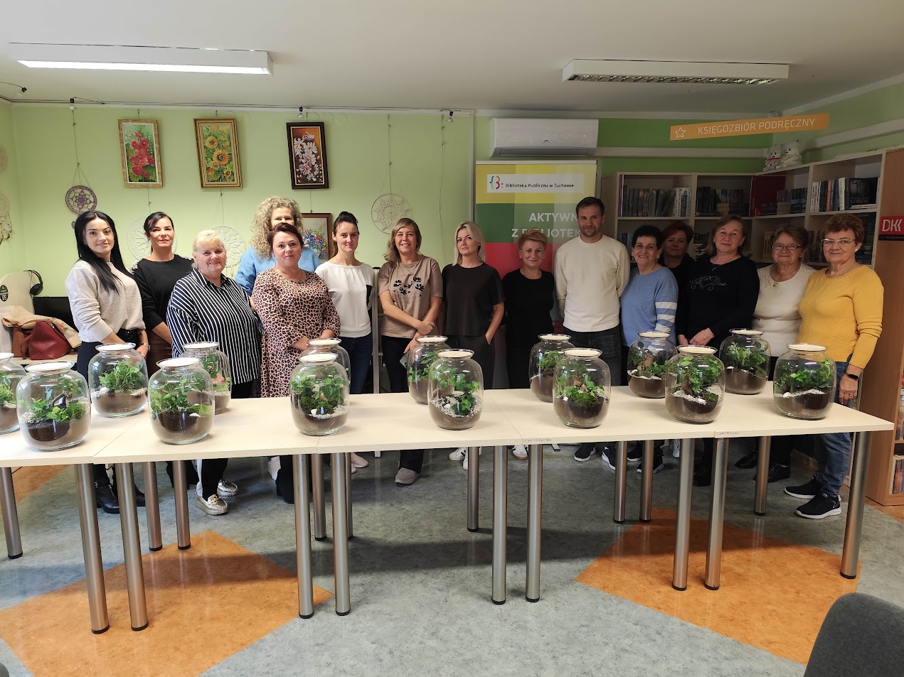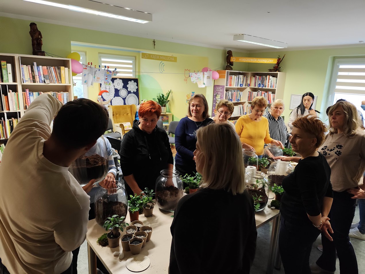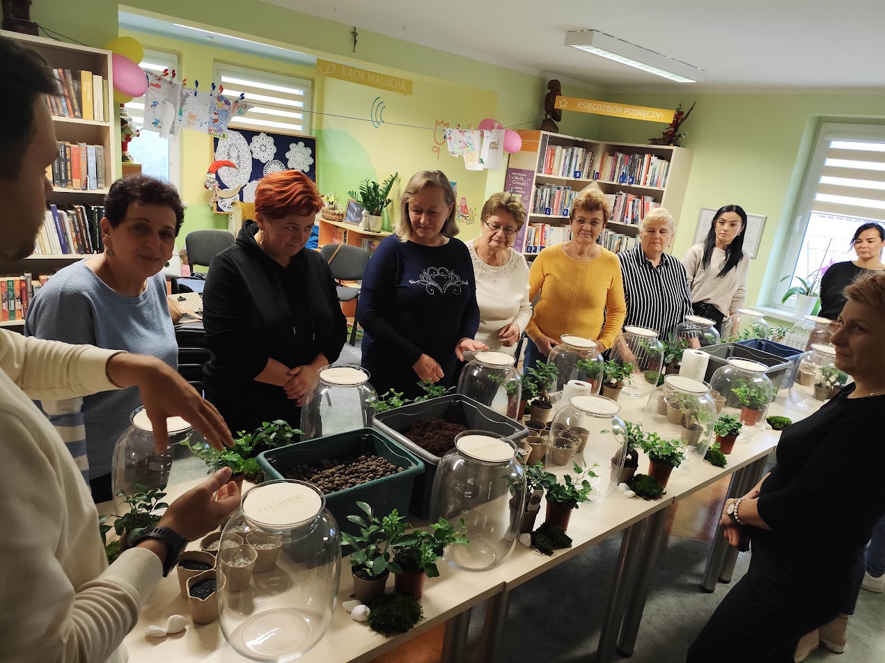 „W zgodzie z pięknem i naturą” – inicjatywy realizowanej przez Koło Gospodyń Wiejskich w Jodłówce Tuchowskiej. Projekt został dofinansowany przez Bibliotekę Publiczną w Tuchowie w ramach programu „BLISKO – Aktywnie z biblioteką”. Był on odpowiedzią na lokalną potrzebę integracji, edukacji oraz wspólnego działania. Tym razem uczestniczki spotkania zostały zaproszone do stworzenia lasu w słoiku – naturalnego, samowystarczalnego ekosystemu zamkniętego w szkle. Warsztaty poprowadził Pan Piotr Krawczyk z pracowni „LASWSŁOIKU BY LEŚNY SŁÓJ”. Dzięki jego instruktażowi powstały piękne, zielone ogrody w miniaturowych szklanych przestrzeniach, które uczestniczki zabrały do swoich domów. Podczas spotkania odbył się także krótki wykład o tym, jak pielęgnować i dbać o swoje roślinne kompozycje. Na zakończenie nie zabrakło kawy, ciasta, wspólnej rozmowy i świętowania finału projektu. Serdecznie dziękujemy wszystkim, którzy wzięli udział w zorganizowanych wydarzeniach oraz osobom zaangażowanym w realizację projektu za wspólne działania i entuzjazm!