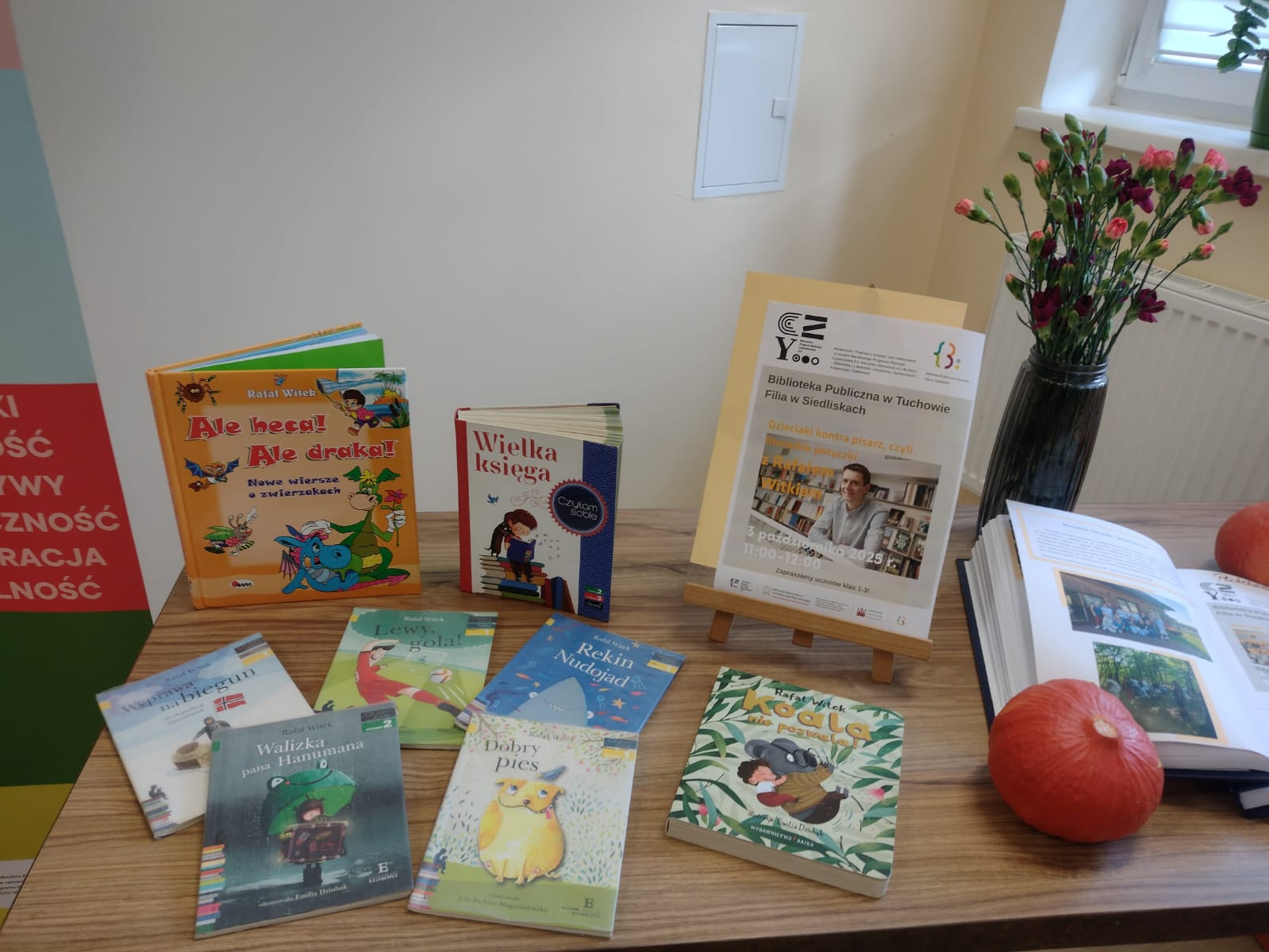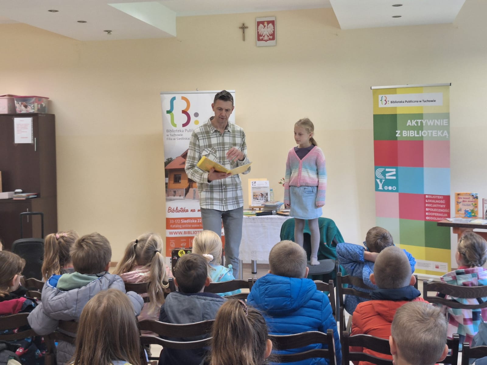 Po spotkaniu w Jodłówce Tuchowskiej odbyło się także spotkanie z czytelnikami w Filii w Siedliskach. Odbiorcami tym razem byli nieco młodsi czytelnicy. Były zagadki literackie, quizy, wspólne czytanie a także kreatywne tworzenie treści literackich. Na zakończenie wspólne fotografie i zakładki dla każdego uczestnika spotkania.