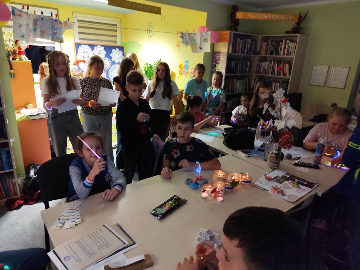 17 października 2025 roku odbyła się 11. edycja ogólnopolskiej Nocy Bibliotek. W wydarzenie tradycyjnie włączyły się Biblioteka Publiczna w Jodłówce Tuchowskiej oraz Biblioteka Szkolna, które wspólnie przygotowały dla młodych czytelników wyjątkową, pełną emocji i dobrej zabawy noc. Tegoroczne hasło brzmiało „Do dzieła!” – i wszyscy potraktowali je bardzo dosłownie! Na początek nasi uczestnicy wcielili się w młodych detektywów, których zadaniem było odnalezienie zaginionej Księgi Wszystkich Opowieści. Zadania wymagały sprytu, spostrzegawczości i współpracy – a radość z odnalezienia skarbu była ogromna! Kiedy emocje opadły, przyszedł czas na twórcze działania inspirowane Marią Pawlikowską-Jasnorzewską, patronką roku. Zapoznaliśmy się z życiorysem poetki, odkrywaliśmy świat jej poezji, czytaliśmy wiersze i tworzyliśmy własne dzieła inspirowane jej twórczością. Powstały piękne, artystyczne kolaże i kolorowe kamienie z cytatami z utworów poetki. Uczestniczyliśmy w literackiej zabawie „Blackout Poetry”, która pozwoliła spojrzeć na poezję w zupełnie nowy sposób. Był też czas na ruch i muzykę: tańce oraz poezję śpiewaną – wraz z Sanah śpiewaliśmy „Pocałunki”. W części artystycznej chętne dzieci tworzyły nastrojowe lampiony ze słoików, dekorowały biblioteczne drzewko czytelnicze oraz ozdabiały plakat Nocy Bibliotek według własnych pomysłów. A w międzyczasie można było zrelaksować się w ulubionych strefach zabawy: przy X-boxie, piłkarzykach, komputerach i grach planszowych. Szczególnym punktem programu było pierwsze w tym roku szkolnym spotkanie Dyskusyjnego Klubu Książki – i to w nowym składzie! Rozmawialiśmy o książce „Walizka pełna marzeń” autorstwa L. Bardijewskiej, dzieląc się swoimi spostrzeżeniami i emocjami. Serdeczne podziękowania kierujemy do wszystkich uczestników za fantastyczną energię, uśmiech i kulturę osobistą, a także do rodziców– za wsparcie i pyszne przekąski, które dodały sił do nocnych przygód z książką. To była noc pełna radości, poezji i wspólnego działania – taka, którą pamięta się długo!