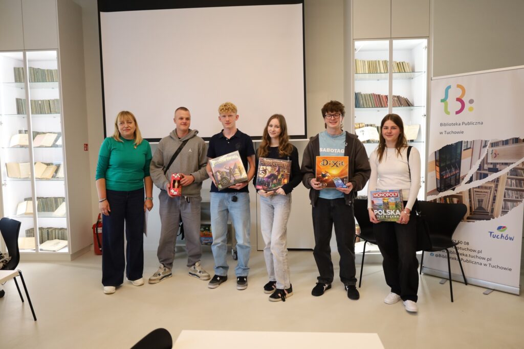 Biblioteka Publiczna w Tuchowie oraz Młodzieżowa Rada Gminy zaprosiły wszystkich miłośników gier planszowych do udziału w I Międzypokoleniowym Turnieju Gier Planszowych, w sobotę 18 października 2025 roku w siedzibie biblioteki przy ul. Chopina 10. Już w piątek przed południem zgłosiło się 37 osób, co zmusiło nas do zamknięcia listy zgłoszeń. To była niepowtarzalna okazja, by w duchu zdrowej rywalizacji i wspólnej zabawy spotkać się, miło spędzić czas, poznać nowe, ciekawe gry planszowe. Niektórzy mogli także wygrać cenne nagrody. Były wielkie obawy, bo pierwszy raz organizowaliśmy takie wydarzenie, ale jak to mówią „pierwsze koty za płoty”. rozgrywki odbywały się równolegle w trzech pokojach o rożnym stopniu trudności gier. Ze względu na ilość uczestników w każdej grupie losowo rozdzieleni zostali oni na kilka stolików, a wszyscy równocześnie najpierw poznawali zasady i rozgrywali rundę próbną, a później rozpoczynała się właściwa rozgrywka. Grupa I grała w UNO, „PĘDZĄCE ŻÓŁWIE”, „BUŁA, PIZZA, KOT, SER, KOZA”, gr. II – „SPLENDOR”, „CATAN”, „ABALONE” a gr. III – „7 CUDÓW ŚWIATA”, „WSIĄŚĆ DO POCIĄGU. EUROPA”, „SPLENDOR” okazało się, że trudniejsze gry były wcześniej nieznane uczestnikom, dzięki czemu szanse były wyrównane. Niezbędne do równoczesnych rozgrywek egzemplarze ABALONE i SPLENDOR wypożyczyła nam firma Rebel, ufundowała też dwie gry jako nagrody dla zwycięzców – bardzo jej dziękujemy!. Pozostałe nagrody i organizację turnieju zorganizowaliśmy w ramach zadania „Aktywnie z Biblioteką” dofinansowanego ze środków Ministra Kultury i Dziedzictwa Narodowego w ramach realizacji Narodowego Programu Rozwoju Czytelnictwa 2.0 na lata 2021-2025.Kierunek interwencji 4.1. BLISKO – Biblioteka | Lokalność | Inicjatywy | Społeczność | Kooperacja | Oddolność. Zaproponowane gry bardzo się spodobały uczestnikom, dzięki czemu wzrosła ilość miłośników „planszówek” i zainteresowanie ta formą spędzania wolnego czasu! Dziękujemy też Młodzieżowej Radzie Gminy Tuchów za udział i pomoc w organizacji Turnieju.