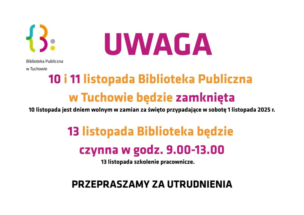 Informujemy, iż w dniu 10 i 11 listopada tj poniedziałek i wtorek – Biblioteka Publiczna w Tuchowie oraz jej filie będą zamknięte. Natomiast w dniu 13 listopada – czwartek Biblioteka w Tuchowie będzie czynna od godz. 9.00 do godziny 13.00 natomiast filie biblioteczne od godz.11.00 do godziny 14.00.